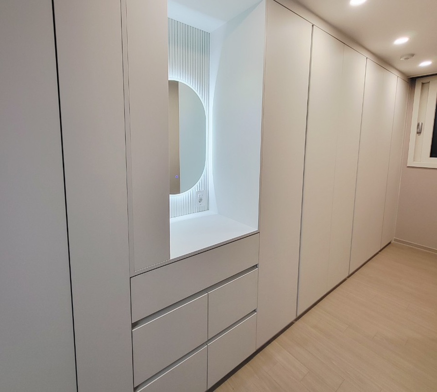 특히 고객님의 요청에 따라 붙박이장 한가운데에 화장대 일체형 공간을 마련했습니다. 은은한 조명이 들어오는 원형 거울과 깔끔한 상판, 그리고 넉넉한 서랍은 매일 아침을 더욱 편리하고 즐겁게 만들어 줄 것입니다. 화장품과 액세서리를 깔끔하게 정리할 수 있는 서랍 구성은 물론, 거울 주변의 섬세한 디자인은 공간의 품격을 한층 높여줍니다. 기능성과 심미성을 모두 갖춘 이 화장대 공간은 고객님의 일상에 특별함을 더해줄 것입니다.
