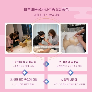 주1회 5주속성으로 피부미용사국가자격증 원패스가능! 원포인트레슨으로 원패스가능! 2번, 3번 떨어진 재수생도 원데이 클래스로 합격가능! 심사위원출신 합격비법제공