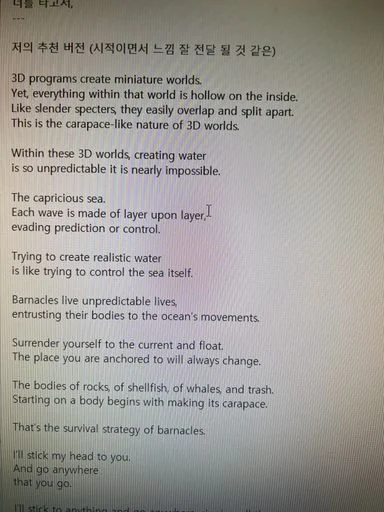 시적인 문장이 많았는데 다양한 느낌으로 여러 버젼으로 번역해주셨어요. 무엇보다 원어민이기 때문에 감각적인 번역을 해주시리라 믿고 했습니다! 다음에 또 올게요 감사합니다