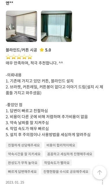 두번째 리뷰 ️⭐⭐️️⭐️⭐️⭐️ 작년에 숨고를 통해 신혼집 블라인드와 커튼 시공을 부탁드렸고.. 당시 너무 친절하셨다는 것, 결과에 크게 만족하였던 것 등 좋은 기억들이 남아있었습니다! 이번에 이사하게 되면서, 새로 커튼들을 해야하는 상황이라 또 부탁드리게 되었네요. ^^ 역시는 역시입니다. 이번에도 매우 만족하며, 적극 추천합니다. <좋았던 점> 👍약속 날짜•시간 엄수 👍친절 👍합리적 비용 👍빠르고 꼼꼼한 시공 덧붙여, 기존에 가지고 있던 커튼을 어떻게 활용할 수 있을지 소비자의 입장에서 고민해주시고.. 시공 전, 후로 설명도 꼼꼼히 해주셔서 커튼에 대한 이해도도 높아진 것 같습니다. 색상 등 제품 고민이 되었는데, 인테리어 적으로 어울리는 것으로 추천도 잘 해주셨고요. 집은 확실히 커튼 하고 안하고 미적으로도 차이가 많이 나네요. 커튼 하고나니 한층 더 아늑하고 우아해보여요. 이번 겨울에 방한도움이 좀 되길 기대해봅니다. 사장님 적게 일하시고 많이 버세요!