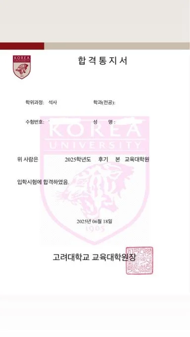 고려대학교 교육대학원 2025 후기전형 최초합 합격생입니다! 교육대학원을 막연히 생각만 하고 있었을 뿐, 처음엔 정말 아무것도 몰랐습니다. 학업계획서는 어떻게 써야 하는지, 무엇을 공부해야 하는지도 감이 전혀 없었고, 교육대학원 자체가 정보가 부족해 혼자 준비하기엔 막막함이 컸습니다. 그런데 문선생님은 처음 진행하는 무료 상담부터 정말 성의 있게, 오래 시간을 들여주셨습니다. 누구에게나 똑같은 방식이 아니라, 제 상황을 꼼꼼히 들어주시고 거기에 맞춰 전략을 짜주는 느낌이었습니다. 무조건 “합격할 수 있다”고 하는 게 아니라, 어떤 점은 가능성이 높고, 어떤 점은 보완이 필요하다는 식으로 객관적으로 판단해주신 점도 신뢰가 갔습니다. 기초적인 부분부터 하나하나 짚어주시고, 첨삭도 횟수 제한 없이, 밤낮없이 정말 열정적으로 도와주셨습니다. 제가 불안해할 때마다 할 수 있다고 끊임없이 격려해주신 덕분에, 끝까지 자신감을 잃지 않고 준비할 수 있었습니다. 그 결과, 제가 가장 가고 싶었던 1지망 고려대학교 교육대학원에 최초합 할 수 있었습니다. 정말 감사합니다!