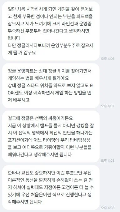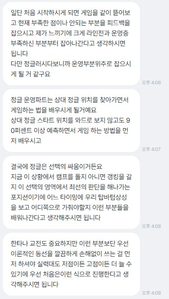 숨고 이용도 게임 수업도 처음이라 어떻게 진행되는지 잘 몰랐는데, 수업 전 상담부터 대략적인 방향과 제가 배우게 될 내용을 자세하게 설명해 주셔서 어떤 걸 배울지 안 상태에서 진행하다 보니 훨씬 더 도움이 되었습니다. 게임을 차분하게 관전하시면서 제가 부족한 부분이 어디인지 잘 짚어주셨어요. 롤을 잘하진 못해서 기초적인 개념은 유튜브에서 볼 수 있는 내용과 크게 다르지 않더라도 비유를 통해서 더 자세히 설명해 주시고 제가 딱 모르는 부분에 대해서 상세하게 알려주시니 유튜브로 보고 혼자 연습하는 것보다 더 많이 알 수 있었습니다. 관전 피드백 후 다음 게임에서는 실시간으로 큰 줄기만 짚어주시니 제가 게임을 할 때 어느 타이밍에 실수하는지 실시간으로 알 수 있어서 이게 정말 컸습니다. 관전피드백보다 실시간으로 부족한 부분을 알게 된 게 정말 큰 소득이었어요. 알려주신 내용을 좀 더 연습해서 익숙해지면 또 수업 신청해보려고 합니다 롤이 다시 재밌게 느껴지네요 감사합니다!