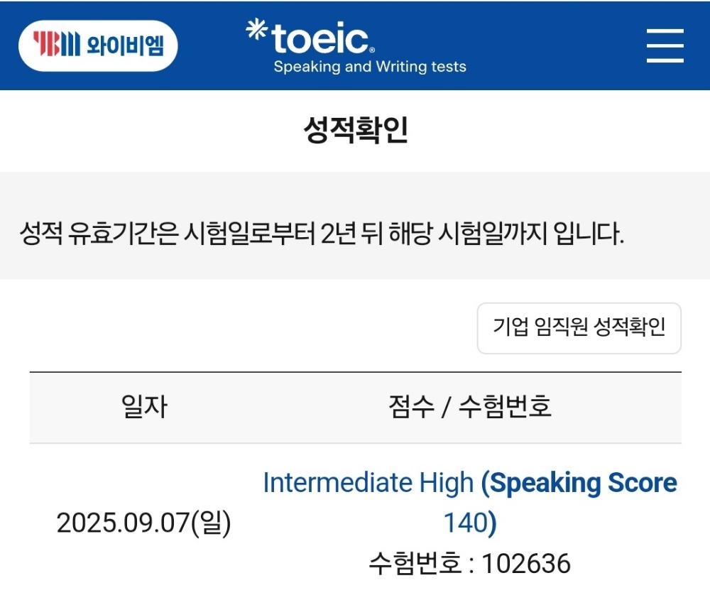 원하는 기간 안에 원하는 성적 바로 취득했어요! 커리큘럼도 탄탄해서 선생님께서 하는 대로 그대로 따라만 했는데 목표 달성했습니다 ㅎㅎ 제가 시간이 너무 없어서 급박하게 준비했고 마지막에는 결국 다 하지는 못했는데 그래도 목표점수 달성했어요! 너무 감사드립니다 😆