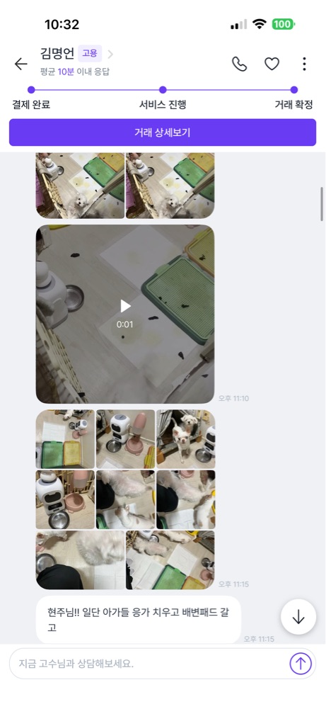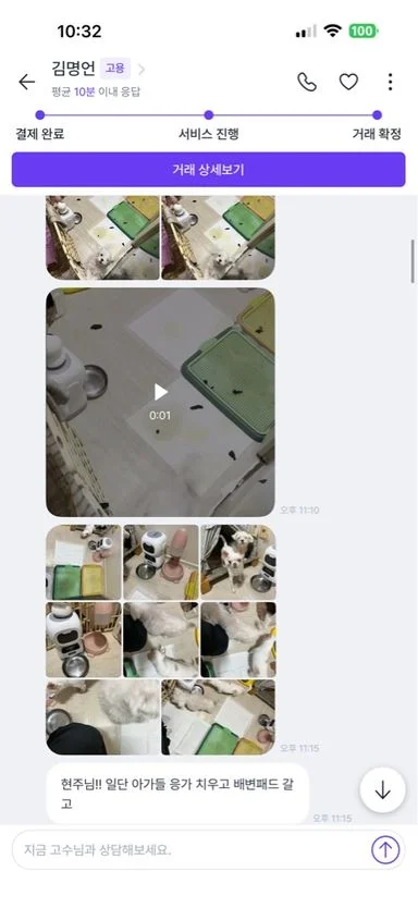 아버지 홀로 강아지 두마리 키우시는데 갑작스레 입원 및 수술을 하게 되면서 강아지들이 너무 걱정됐었어요ㅠㅠ 서울에서 살고있는 저는 저희집에 반려동물 금지라 데리고 오지도 못하고 그렇다고 호텔에 맡기기엔 비용도 비용이지만 학대할까봐 무서워서 못맡기겠고 친구들에게 맡기기엔 한마리가 아니라 두마리라 부담스러워 할거고 그래서 일단 급하게 자동급식기를 구매하고 물도 가득채워놓고 나왔었어요 제가 주말에 내려와 케어한다해도 주중에 사람의 손길이 안닿는다고 생각하면 너무 마음이 아파서 챗지피티에게 물어보니 숨고에서 펫시터를 구해보는게 어떻겠냐 하더라구요 그래서 바로 견적서 올렸는데 운좋게도 명언님께서 신청해주셔가지고 명언님께 케어받게 됐습니다❤️ 저희 애들 예뻐해주시고 요청사항대로 해주시고 사진도 찍어보내주셔서 너무너무 안심 됐어요ㅠㅠ 너무 만족해서 다음에도 부탁드리려구요..🫶🏻