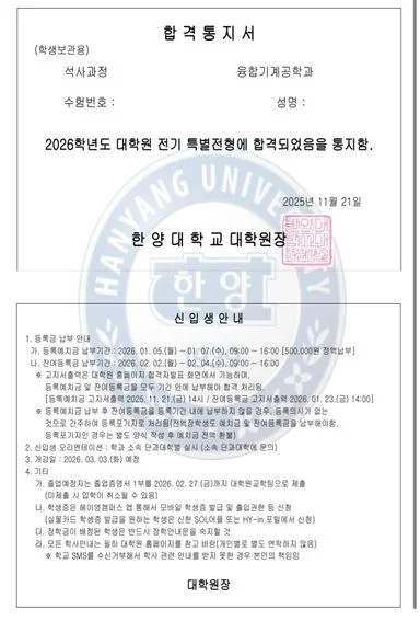 26년 전기 대학원 입학을 목표로 준비하던 중, 연구 계획서 작성과 면접 준비 방향을 잘 모르겠어서 문선생님께 연락드리게 되었습니다. (상담) 처음 상담을 진행하면서 선생님께서 매우 친절하게 방향을 제시해 주셨습니다. 대학원 준비에 필요한 프로세스와 전략을 명확하게 설명해 주셨고, 그때부터 선생님에 대한 신뢰가 생겼습니다. (연구 계획서 코칭) 연구 계획서를 작성하는 단계에서는 선생님만의 체계적인 작성 가이드가 큰 도움이 되었습니다. 가이드에 맞춰 작성하니 흐름을 잡기 쉬웠고, 작성에 필요한 참고 논문도 요청하면 빠르게 보내주셨습니다. 또한 첨삭을 받으며 논리 구조나 표현이 크게 개선될 수 있었습니다. (면접 코칭) 면접 준비 과정에서는 선생님이 정리해주신 예상 질문 리스트를 기반으로 준비했습니다. 마지막에는 모의 면접도 진행했는데, 실제 면접처럼 질문을 받고 피드백을 받으면서 부족한 부분을 확실하게 보완할 수 있었습니다. (결과) 연구 계획서와 면접 코칭을 기반으로 26년 전기 대학원 지원을 진행했고, 한 곳만 지원했지만 최종 합격할 수 있었습니다. 저처럼 대학원 준비 과정이 막막하신 분들께는 문선생님 컨설팅을 진심으로 추천드립니다.