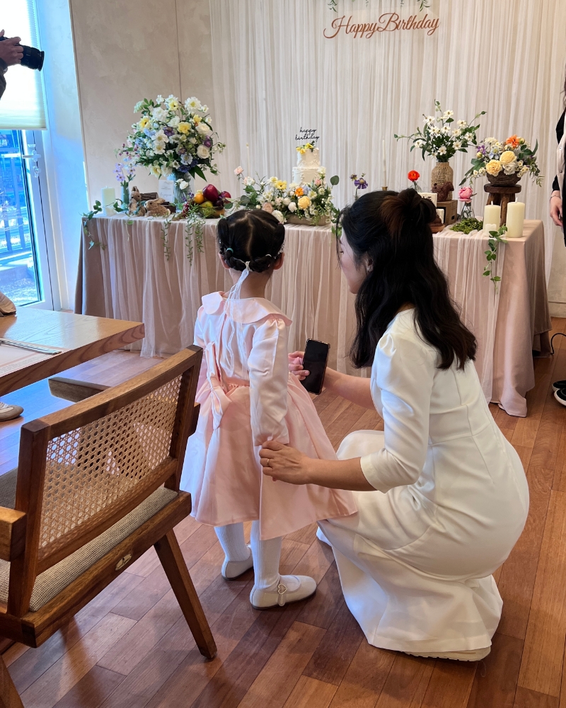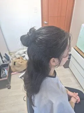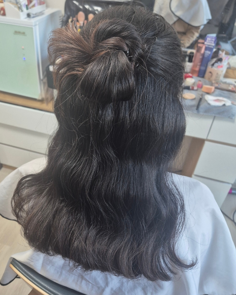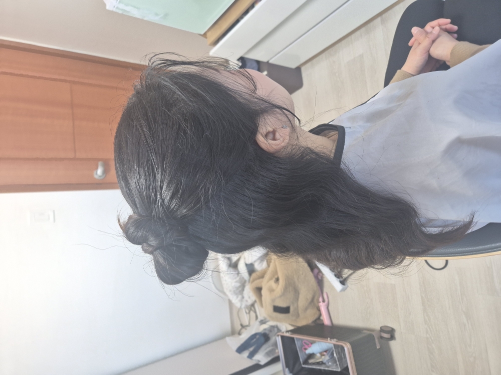 아기 돌잔치로 예약하게 되었습니다. 둘째 아기라 소소하게 가족끼리 식사만 하려고 했다가 급하게 헤어메이크업 알아보게 되었는데 이른 시간에도 흔쾌히 와주시고 예상시간보다 더 빠르게 끝내주셔서 여유있게 행사장에 도착할 수 있었습니다. 마지막까지 반묶음과 로우번 중에 고민했는데 그날 제 의상을 보시고 반묶음 추천해주셨고 요즘 유행하는 뻗침 머리와 애교 옆머리도 해주셨어요 ㅎㅎ 피부 표현도 잘 해주시고 조금 더 어려보이고 싶은 마음에 핑크...핑크하게 해달라고 부탁드렸는데 나이는 조금 못 속이더라구요 ㅎㅎ 그래도 만족합니다 야외 촬영이 있었는데 바람이 엄청 불었지만 머리가 흐트러짐도 풀림도 없었습니다. 물론 남편 머리두요! 저희 양가 가족들 모두 헤메 칭찬 가득했어요. 집에 도착하고 키즈카페에서 놀았는데도 헤메 무너짐이 없었어요 고민 중이시라면 적극 추천합니다.